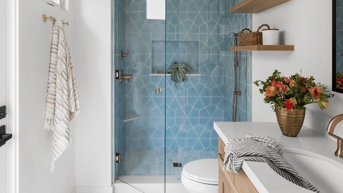 Geometric tile patterns are becoming a popular alternative to traditional rectangular layouts. These soft blue tiles create a subtle repeating pattern that adds visual interest without feeling overwhelming. Combined with floating shelves and light wood cabinets, the shower becomes the highlight of the bathroom.