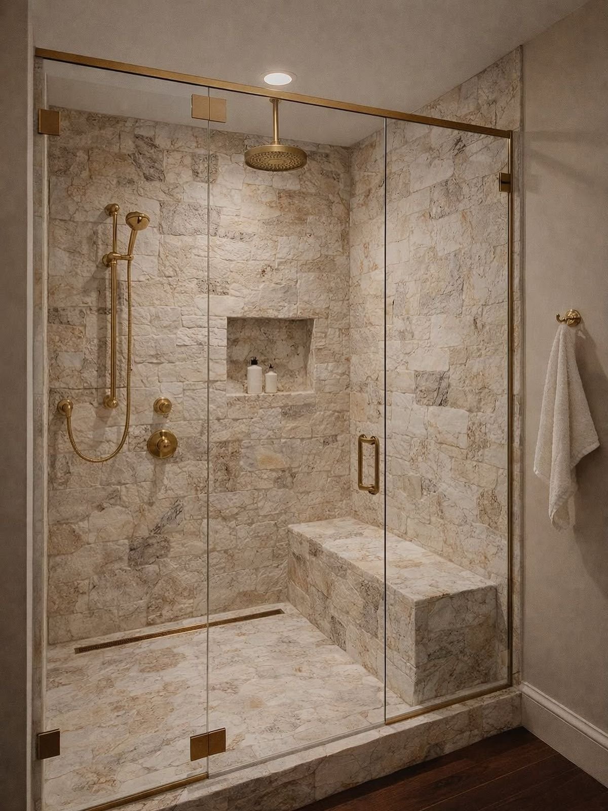 The bench uses the same textured stone as the walls, creating a consistent surface throughout the enclosure. Warm tones and brass fixtures bring depth without stark contrast.