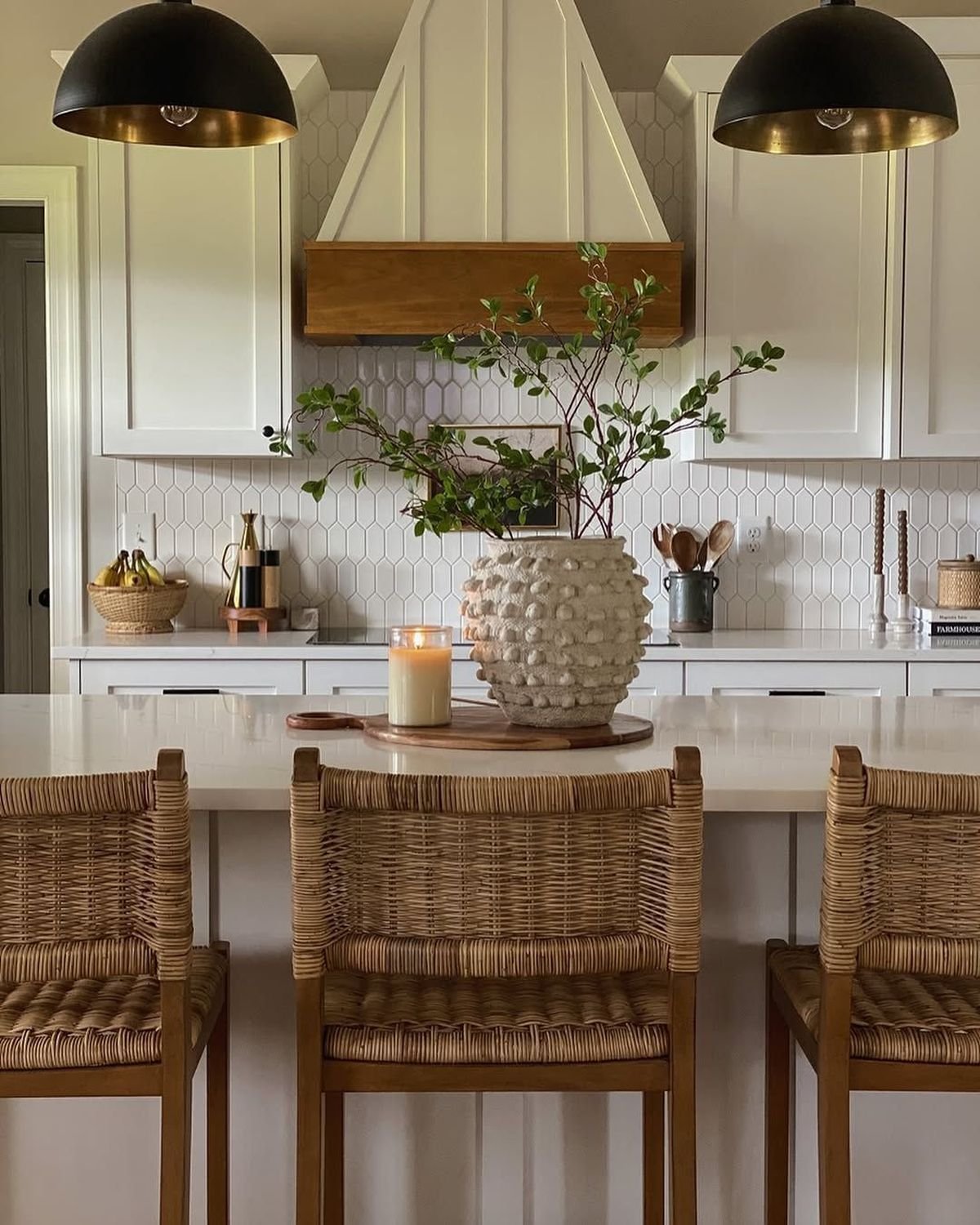 The cane backs and wooden frame create a consistent warm tone throughout the island. Seating becomes part of the overall palette rather than a highlight.
