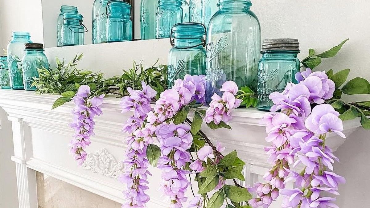 Lavender garland mantel with glass bottle contrastLavender garland mantel with glass bottle contrast