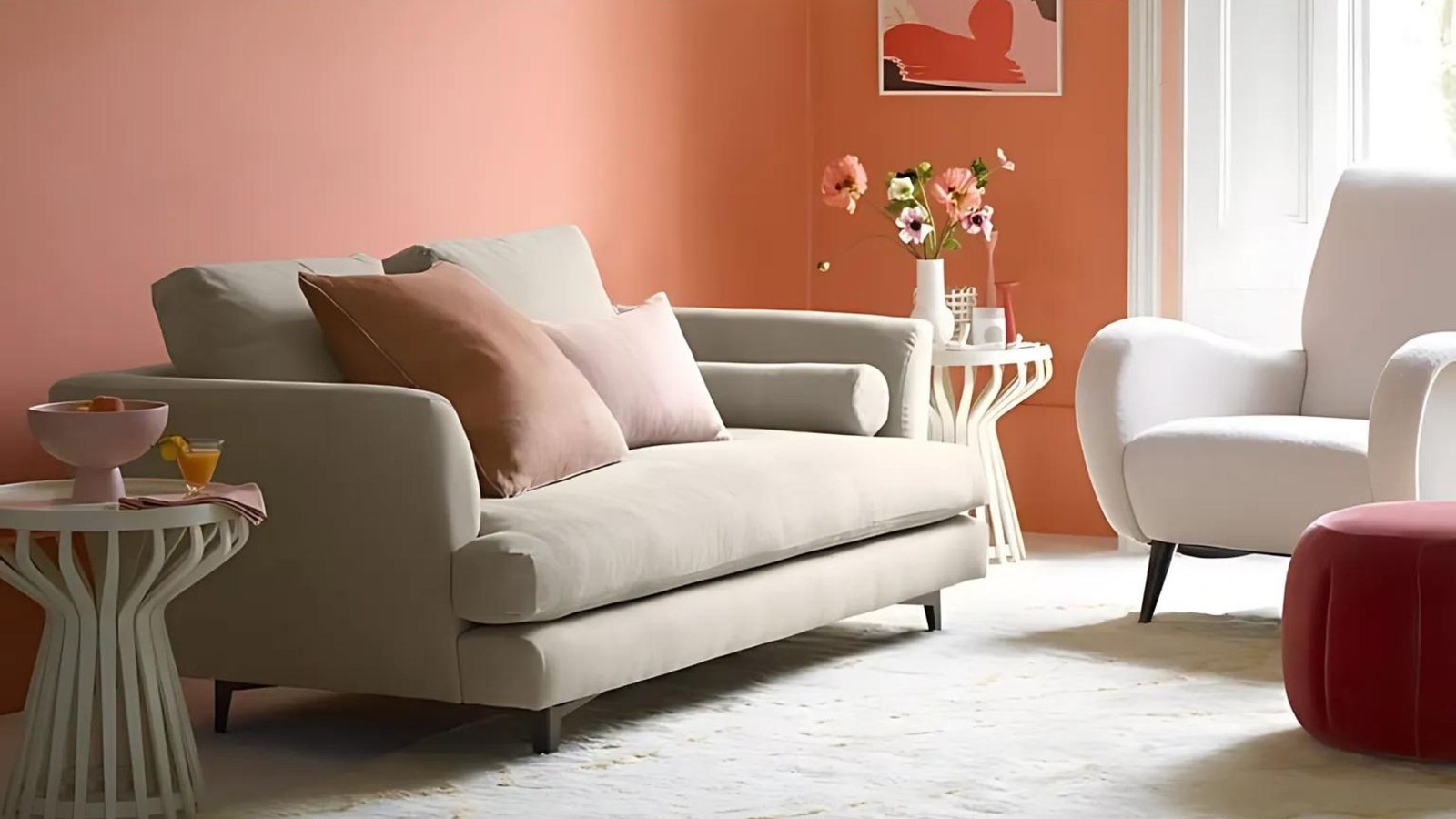 A pale pink sectional will give you just enough ‘pink’ to see that you like it and it looks great with white. Pair it with an antique rug with a pink background and see how you like it. If it’s highlighted, consider painting your walls as well.