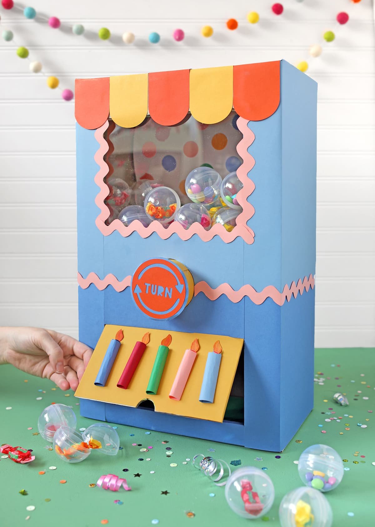 Learn how to turn a cardboard box into a working vending machine to use as a fun birthday party favor.