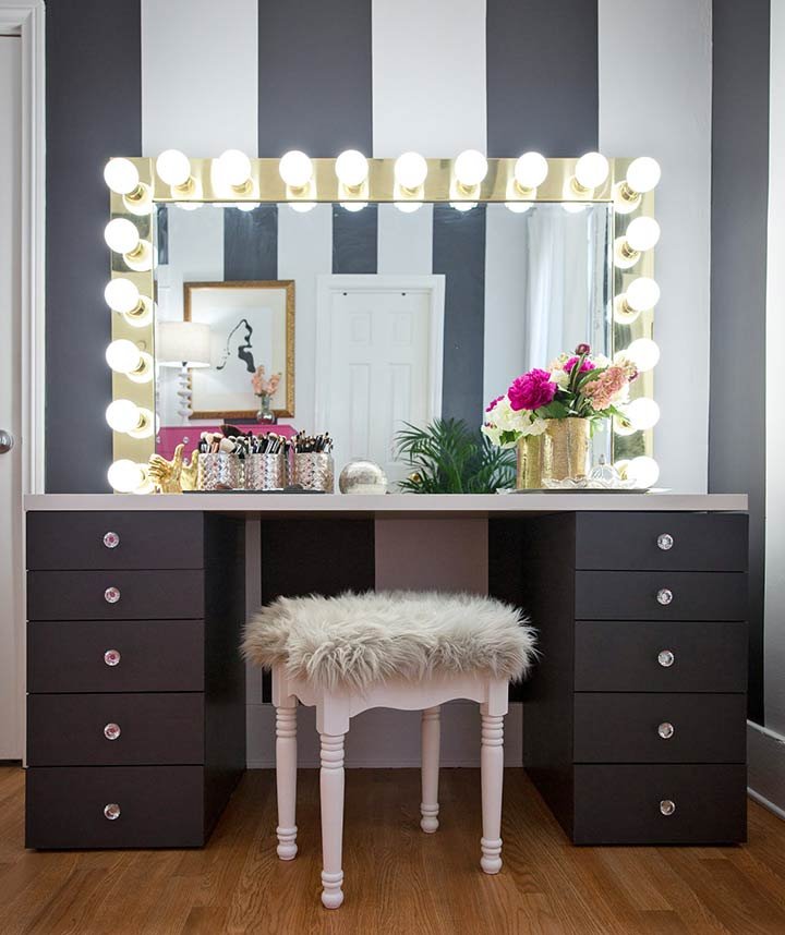 That’s what adds drama and glam to this room only As important as it solves the problem. If you’re looking for a high-end look, try this DIY black vanity mirror with lights.The Sorry Girls‘ Pop over and check them out other 3 ways to set up your dream vanity! I’m hooked on stick on globe lights to use for a project, and love a super easy shadow box DIY vanity mirror that requires no serious tools!