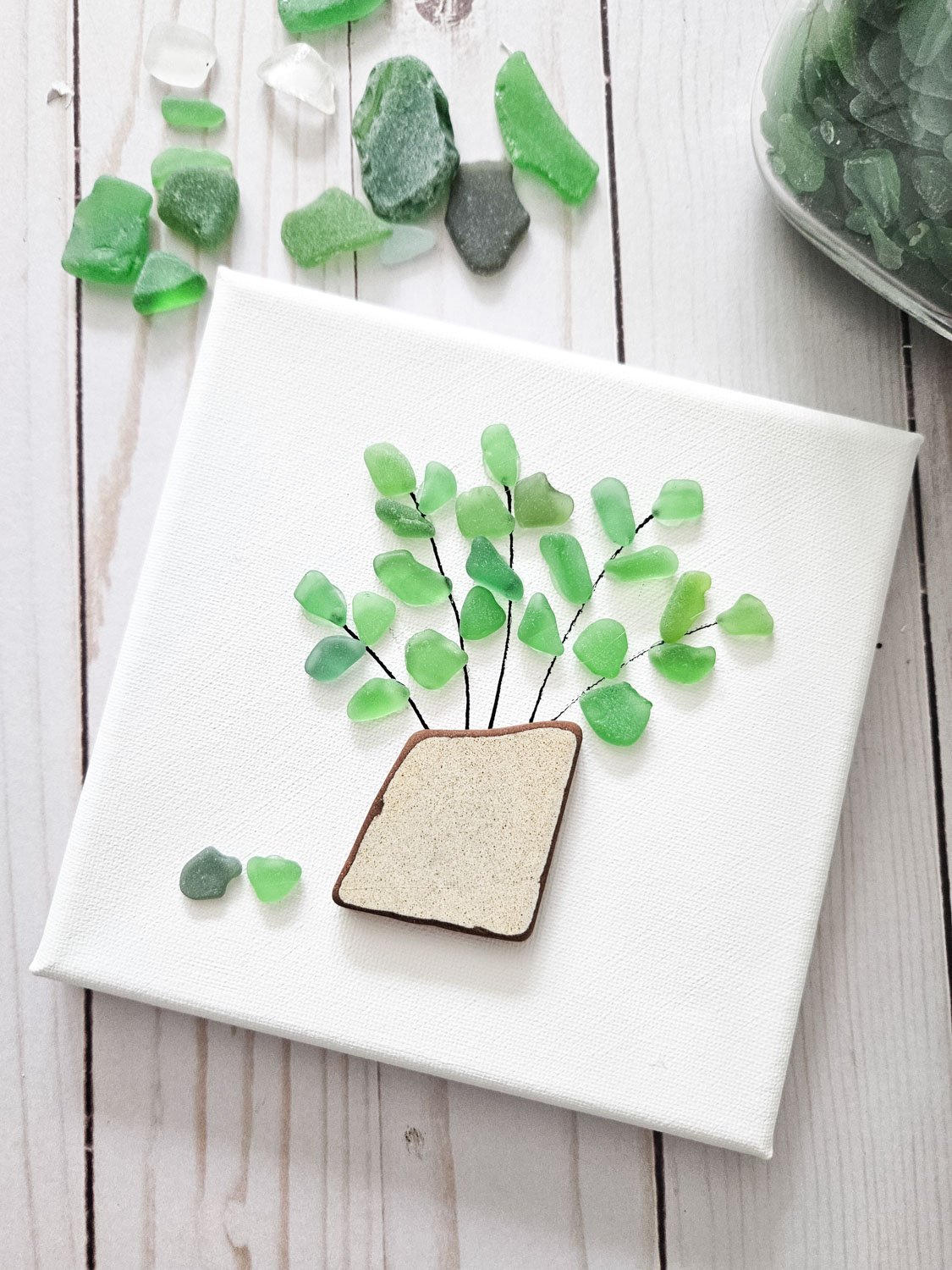 Form the design directly onto the canvas. In our case, we wanted to create an image of a small houseplant, so we positioned the ceramic piece for the vase in the bottom half of the canvas. Leaving plenty of room for the stems and pieces of beach glass on top.