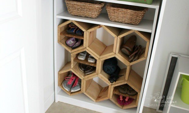 Aimee atCrazy Craft LadyDid this great tutorial for ‘Designer Trapped’ of this hexagon DIY shoe storage. This is a robust project that can be added to over time.