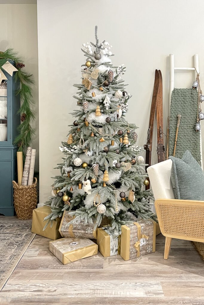 Scandi style Christmas tree decorating ideas using neutral ornaments, brass bells and…