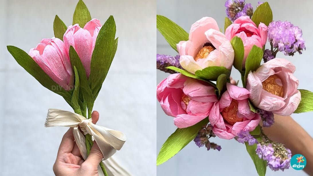 Chocolates and flowers? Count me in! This paper tulip is the cutest spring craft. It is beginner friendly and so easy to make. It’s also perfect for Easter. If you are looking for a DIY gift for your loved ones or friends, these chocolate flowers are the right choice. what are you waiting for Grab some crepe paper and try these paper tulips!