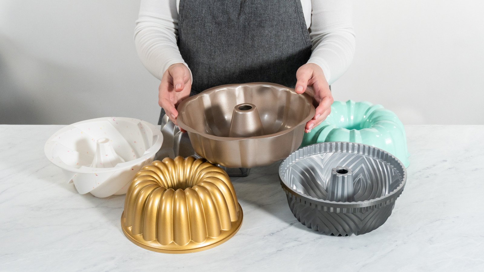 Bundt pans are a step up from traditional baking pans, as they have a lot more personality. These special bakeware sets have a unique shape, usually with fluted edges. The stylish border gives the finished cake a unique look and bakes it more evenly. Besides expanding your baking technique, Bundt pans can be used in a variety of other ways around the homeaway from the kitchen. You can even transform a thrifted bundt pan into a high-end decoration like a classy dining or living room centerpiece. Along with a can of spray paint, any bundt pan can complement your interior design.